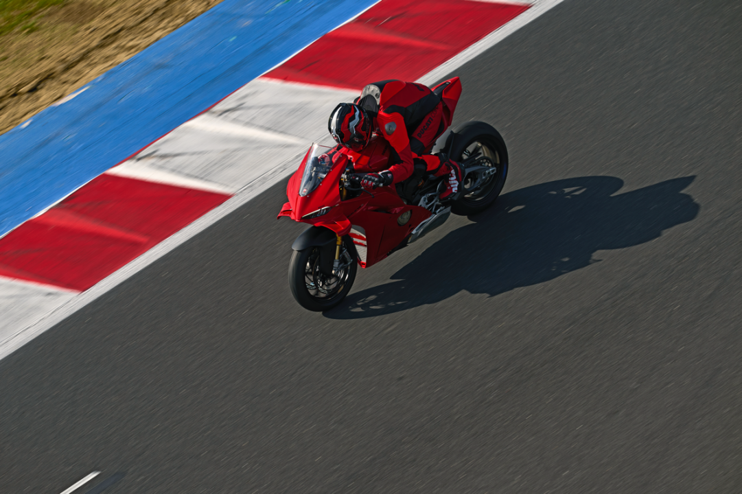 骑行三角和车身细节亦经过精心优化:油箱形状、座垫和侧板经过重新塑形,提供了更大的活动空间与支撑面积,方便骑手在刹车、入弯时紧贴油箱稳定身体,并在加速出弯时更轻松地移动重心。脚踏较前代车型内移了10毫米,提高离地间隙的同时让双腿紧贴车身以降低风阻,这些改进令骑手能够更完美地隐藏在整流罩后,减轻高速风压对身体的影响,在赛道上长时间骑行也更舒适自如。