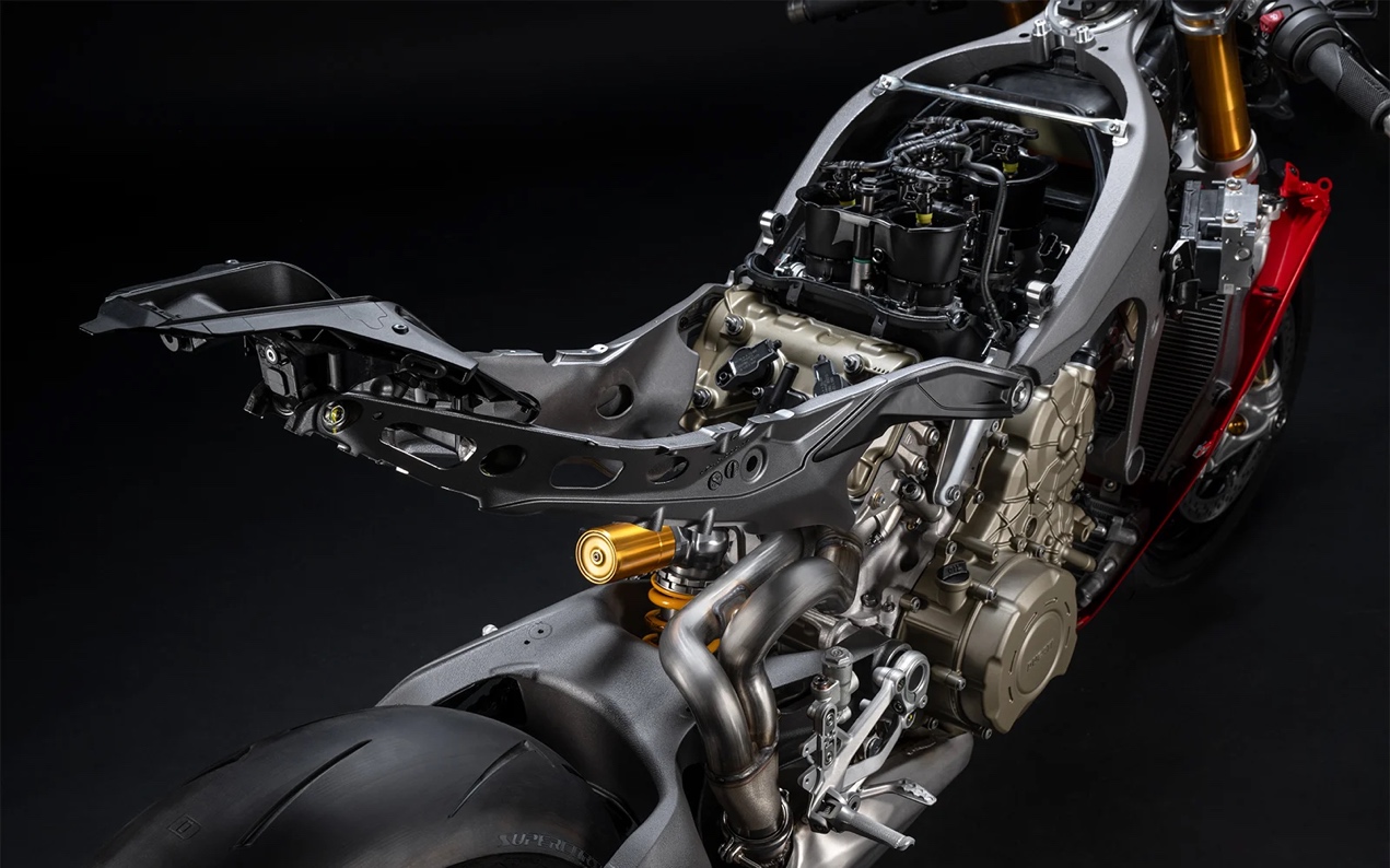 轻量化车架与全新中空对称摇臂:为了充分释放赛车级别轮胎的潜力,杜卡迪工程师为全新PanigaleV4开发了全新的车架与后摇臂结构。新款铝合金前车架减重约17%且优化了刚性分布,横向刚度相比前代降低40%,使车辆在大倾角过弯时抓地力更强、反馈更清晰,同时依然保持高纵向刚度,确保强力加速和制动时的稳定性。后悬挂采用杜卡迪创新的铝制中空对称摇臂(Aluminium Hollow Symmetrical Swingarm)取代了经典的单摇臂设计。这一改变大幅提升了赛车化性能:新的双摇臂使横向柔性提高(横向刚性相对旧款单摇臂降低37%)并通过两个大型减重槽进一步减轻簧下质量,配合源自Desmosedici GP赛车设计的轻量化锻造轮毂,全新底盘让车辆在出弯加速时牵引力更强,方向转换更加敏捷,从业余骑手到专业车手都能感受到更自信从容的操控极限。