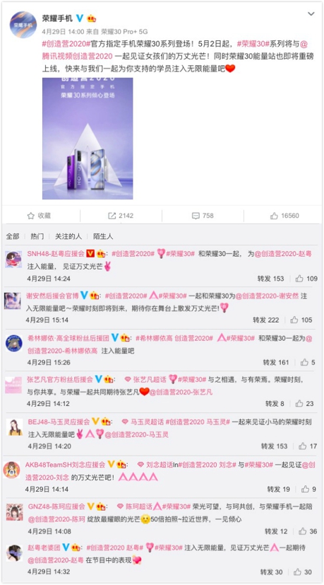 4月29日,荣耀30系列官宣了与创造营2020合作的微博, SNH48成员赵粤、洛丽塔圈顶流谢安然、全能ACE希林娜依·高、时代峰峻二公主张艺凡等多位人气学员的粉丝后援会纷纷应援转发。与荣耀30系列一起为女孩们注入无限能量。各路粉丝在社交平台的“病毒式”打call,既保证了荣耀30的高频次曝光,也彰显了今年荣耀30系列的超高人气。可见强势的娱乐营销方式也能更好地激活品牌影响力。