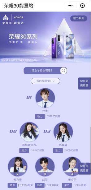 荣耀30系列不仅靠走心的活动实力圈粉,其跟随节目同步上线的“荣耀30能量站”打榜小程序也赚足了视线。微信搜索“荣耀30能量站”直接进入能量站即可为学员打榜,榜单排名第一的学员就可以获得华为全系曝光资源和各种惊喜福利。