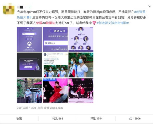 正式官宣后,荣耀30系列顺势以影像实力为支点,在微博开启了#创造营饭拍大赛#的话题活动,鼓励粉丝们在该话题中晒出学员照片。转赞评最高的参与者,可以为ta支持的学员赢得丰厚的华为系曝光权益。