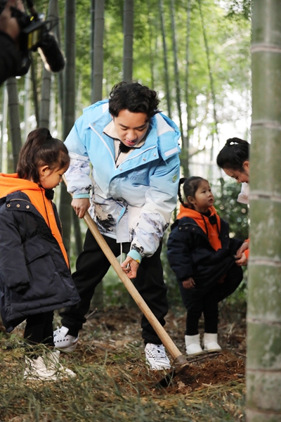 为了寻到新鲜的食材,大家决定一起出发竹林现挖冬笋,途中王祖蓝在接到这组家庭里可爱的两个双胞胎宝贝时,瞬间被孩子们的童音所同化,说话变得奶声奶气,真的是奶爸气质十足。