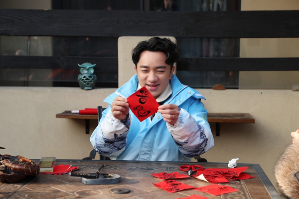节目中,王祖蓝和王琳一组来到杭州余杭区的文化村,两人一路询问终于顺利的找到热情好客并且是做餐饮行业的幸福家庭。面对主人家杭州酱鸭的诱惑,王祖蓝现场机智创作“酱鸭”字体,红红的纸上,酱字搭配萌鸭图案,可谓是书画相融,明了生动。