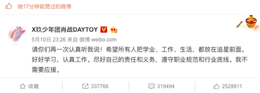 肖战我不需要应援,杨紫深夜点赞。5月10日晚,肖战发文回应网传教师粉丝让班里学生录视频帮他应援一事,“请你们再一次认真听我说!希望所有人把学业、工作、生活,都放在追星前面。好好学习,认真工作。尽好自己的责任和义务,遵守职业规范和行业底线。我不需要应援。 ”随后引发热议。11日凌晨,杨紫点赞了肖战的这条微博。