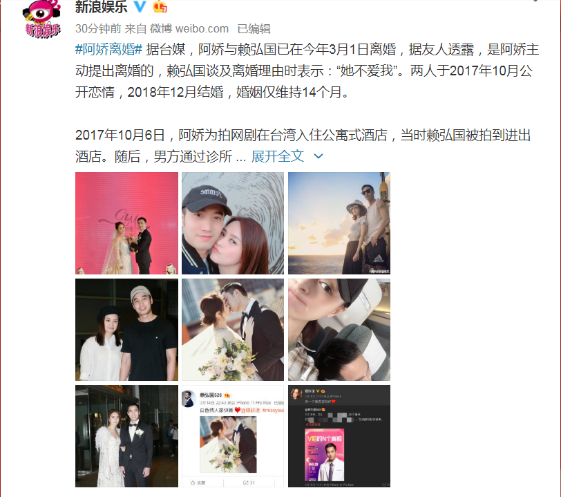 根据了解,这次离婚是由阿娇本人主动提出来的,台湾媒体也向赖弘国方面进行求证,他本人也坦然承认:二人已经于3月1日办理完离婚手续,其离婚是原因就是阿娇并不爱他。